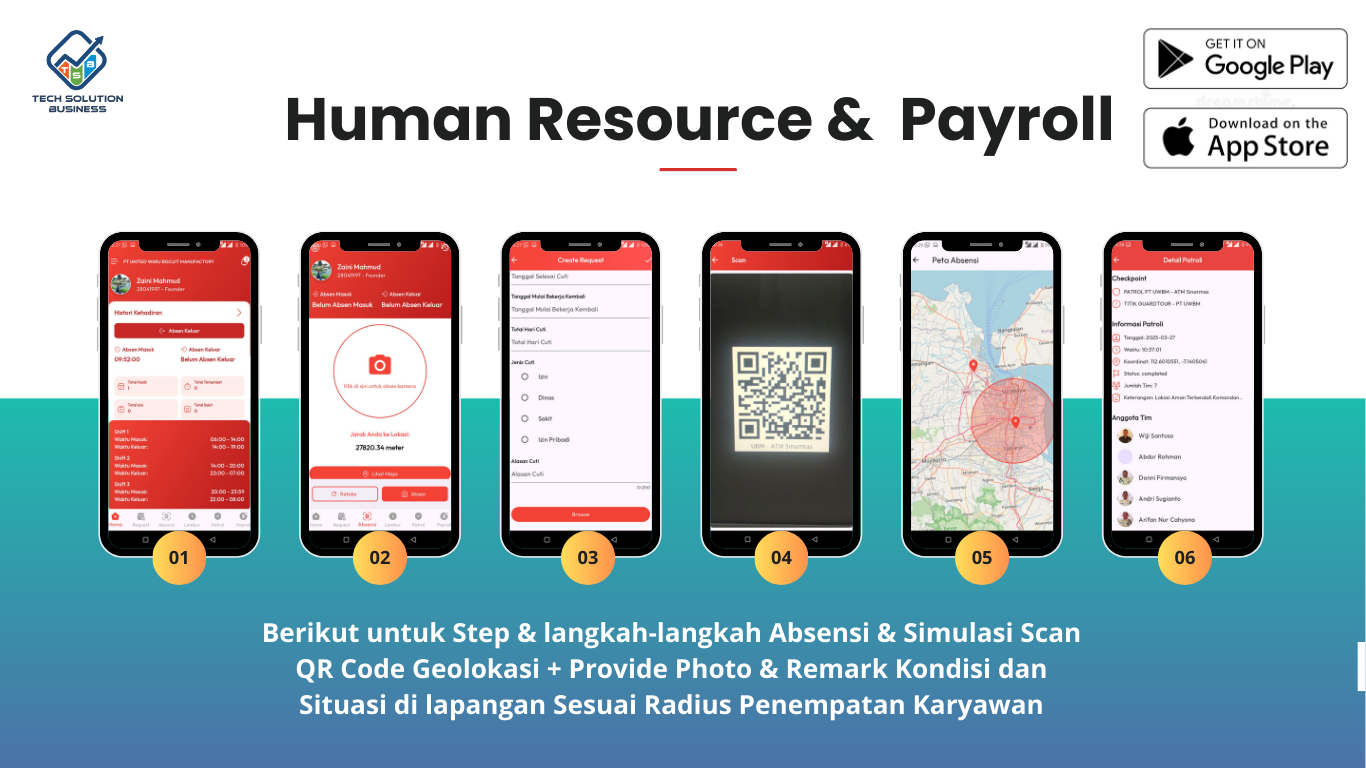 Solusi Tepat Kelola Payroll & Sistem Penggajian Absensi Mobile App yang sudah terintegrasi dengan Payroll Moduler & Kalkulasi Penggajian Pegawai Serta Fitur moduler perhitungan Adjustment & Potongan BPJS + Cost Meal. Cukup dengan Aplikasi 1 pintu yang Praktis, Efisien, & Hemat Waktu.